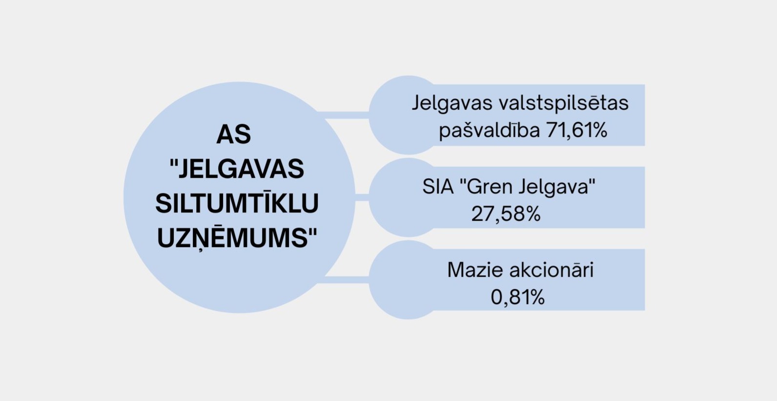 Savukārt ieguldījumus siltumtīklu apsaimniekošanā, uzturēšanā un attīstībā, saskaņā ar saņemto licenci un Akciju sabiedrības akceptu veic 27,58% akciju īpašniece SIA “Gren Jelgava”, kurai visi Akciju sabiedrības aktīvi ir nodoti nomā līdz 2034.gada 1.decembrim. 0,81% akciju pieder mazajiem akcionāriem.